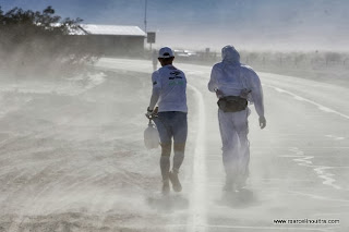O calor estava tão grande no pre-race meeting que meus tênis não aguentaram e descolaram o solado inteiro. Não podia acreditar que a reunião pré-corrida não seria realizada num amplo salão com ar-condicionado (como tudo por ali era) e sim num imenso gramado ao lado da piscina, sem sombras, às 2h da tarde e com a temperatura superior a 50ºC (como pode ver no termômetro mostrado anteriormente). Porém isto já indicava uma preparação para a prova.