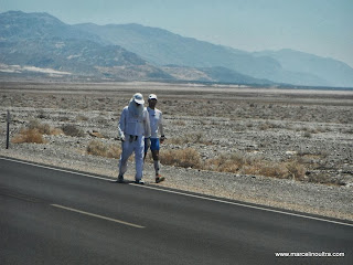 Eu continuava seguindo o Mike, de carro ou a pé junto dele. A temperatura do asfalto chegou aos 94ºC que massacrava os pés de todos. Para fora do asfalto tínhamos agora uma imensidão de areia, estávamos atravessando a Sandy Dunes e Mesquite Dunes.
