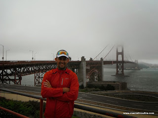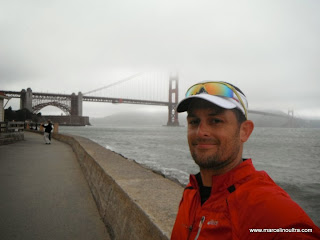Tinha apenas até o dia seguinte para ficar em San Francisco, então aproveitei para ir logo à Golden Gate Bridge, claro que correndo, pois esta ponte permite que se passe por ela correndo, caminhando ou de bicicleta, por uma calçada gradeada.