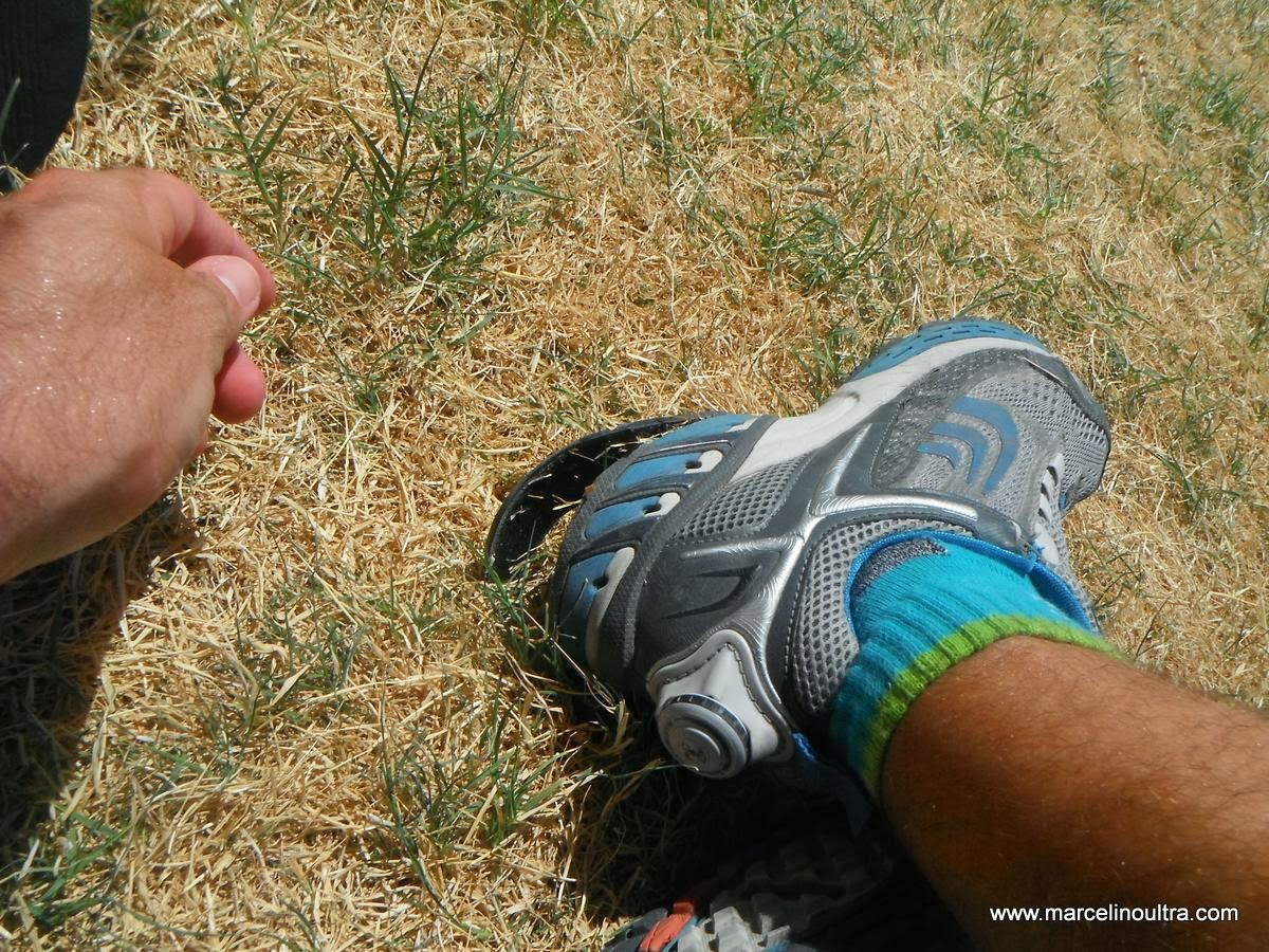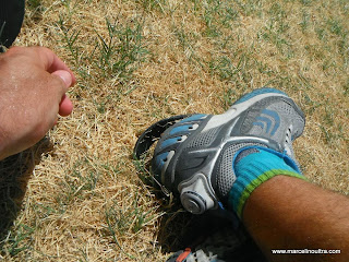 O calor estava tão grande no pre-race meeting que meus tênis não aguentaram e descolaram o solado inteiro. Não podia acreditar que a reunião pré-corrida não seria realizada num amplo salão com ar-condicionado (como tudo por ali era) e sim num imenso gramado ao lado da piscina, sem sombras, às 2h da tarde e com a temperatura superior a 50ºC (como pode ver no termômetro mostrado anteriormente). Porém isto já indicava uma preparação para a prova.