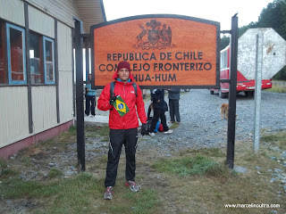 Quando por volta do Km 8 apareceu a placa de 500m para a ADUANA, adotei a tática suicida e deixei Marcelo para trás e deu um super tiro para não pegarmos fila, assim quando o Marcelo chegou já estava em nossa vez de sermos atendidos, era o policial olhar para ele e carimbar o passaporte de saída do Chile. Assim ele ia novamente à frente enquanto eu arrumava o mochila, depois o alcançava.