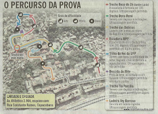 Nos 2km dentro da comunidade, a recomendação é cautela nos degraus das escadarias que levam ao ponto mais alto, onde foi instalada a Unidade de Polícia Pacificadora (UPP), depois do processo de pacificação em 2009. No início da subida, o corredor vai enfrentar 106 degraus estreitos pela frente, seguidos de um trecho de 240m, de mão dupla de atletas, em que a pista será dividida por aqueles que sobem e os que já estão na parte de descida da prova. De acordo com os organizadores, neste trecho haverá grades e cones para garantir a segurança dos participantes.